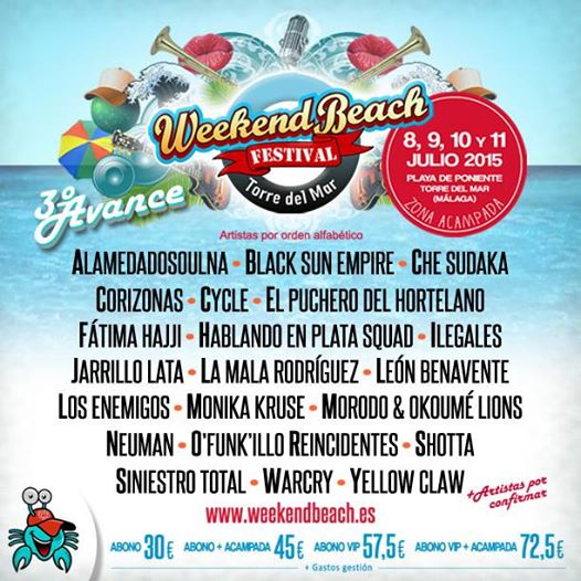 También hay que resaltar el Weekend Beach Festival, el cúal nos ha sorprendido con la confirmación de Yellow Claw, quienes estarán acompañados de momento por Black Sun Empire, Fattima Hajji, Monika Kruse o Cycle en el ámbito electrónico
