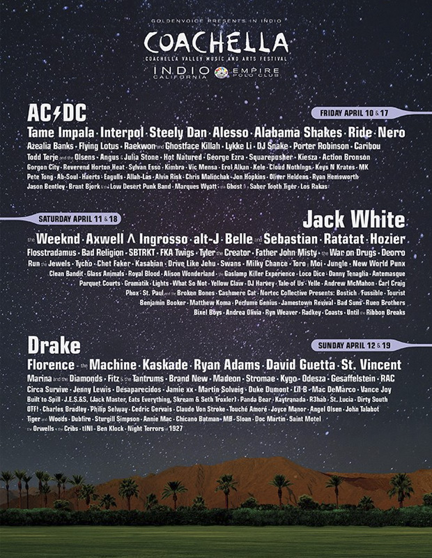 Ayer pudimos conocer del tirón el cartel completo de la edición de 2015 del festival norteamericano Coachella. Entre los cabezas de cartel destacan AC/DC, Jack White, Florence & The Machine, Drake..