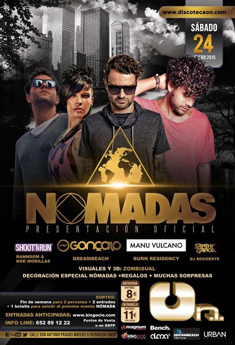 La discoteca On de Bailén acogerá mañana la Fiesta Nómadas en la que se llevará a cabo una grandísima puesta en escena con una decoración especial, regalos, sorpresas y un cartel bastante llamativo con artistas de alto nivel. Tras acercar a la ciudad a grandes artistas como Fatima Hajji o Marcos In Dub a la ciudad, la sala traerá a Gonçalo Miranda, residente del festival Dreambeach. Este se verá acompañado por Manu Vulcano (Burn Residency) y Shoot N Run (Ranndon & Noe Morillas). Completa el cartel el artista residente Shanty Garcia. Cabe destacar que la fiesta no consistirá sólo en las grandes actuaciones de estos artistas, si no que se llevarán a cabo sorteos y múltiples sorpresas para el público, así como unos grandes visuales a cargo de Zombisual en 3D. También se dispondrán diferentes cámaras y drones para grabar el evento. Durante la mañana del sábado, así como las primeras horas de la tarde podrán hacerte con tu entrada por 8 euros. El precio en taquilla será de 11 euros.