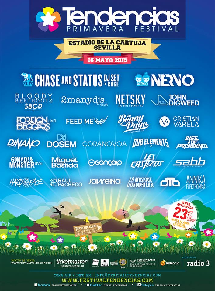 El Festival Tendencias de Sevilla ha dado a conocer su tercera y última tanda de confirmaciones para lo que será su primera edición el próximo 16 de Mayo. Como ya dijimos en entradas anteriores, en evento realizado en el Estadio de la Cartuja acogerá a grandes artistas internacionales como Feed Me, Chase & Status, 2 Many Djs o Bloody Beetroots y artistas nacionales de la talla de Dj Nano, Cristian Varela, Dosem o Dub Elements.