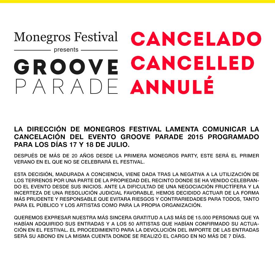Sin duda esta noticia nos deja en estado de shock pese a la polémica que venía arrastrando meses atrás. Y es que tras una larga polémica con el cartel, los malos servicios en los últimos años, el reducir drásticamente el número de abonos para este año, elaborando un extraño sistema de ventas de entradas por días, ha llevado junto a otras causas a tener que cancelar el evento. Posiblemente, lo que muchas especula, ha sido la escasa venta de entradas, que este año podría haberse reducido a porcentajes altísimos con respecto a otros años por estas mismas fechas, debido a la organización y al auge de otros eventos españoles. El cartel de ensueño para muchos durante varias décadas se ha desvanecido. Este año se habían eliminado estilos como Hip Hop, Drum & Bass y Dubstep que habían tenido presencia en las últimas ediciones, con la intención de volver a los orígenes, pasando a volver a llamarse ‘Groove Parade’. Un gravísimo error del cartel de este año era sin duda la no presencia de hard techno y scrachnz, dejando fuera a artistas como Pet Duo, Lukas, Hajji, Fernanda Martins, Malke o Candy Cox, que eran lo del artistas mas queridos.
