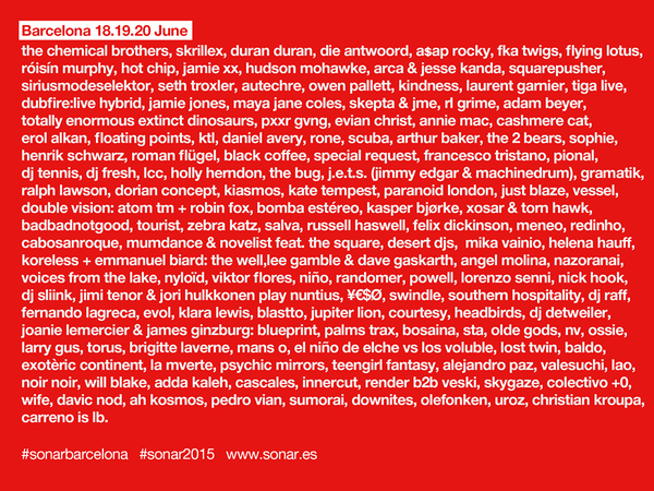 Entre estas fechas tendrá lugar uno de los mayores festivales de la Península Ibérica: Sónar Barcelona. Este gran evento contará con artistas de múltiple índole y géneros musicales. En cuanto a artistas de electrónica podemos destacar a Skrillex, Seth Troxler, Dubfire, Jamie Jones, The Chemical Brothers, Die Antwoord, Rl Grime, Tiga, Adam Beyer, Maya Jane Coles, Scuba, Erol Alkan, Dj Fresh, Pional y un sin fín de artistas de alta calidad. El evento tendrá retransmisión propia y ya conocemos los horarios:
