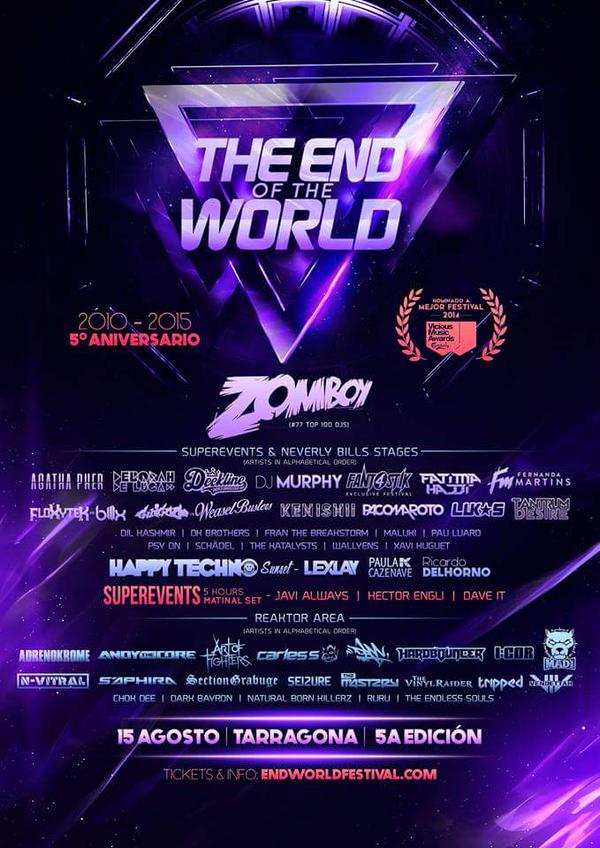 También ayer domingo, o mejor dicho en las primeras horas del lunes (ya que se publicó a las 00:30), conocimos el cartel completo para la quinta edición del festival The End Of The World de Tarragona (15 Agosto). Sin duda un festival muy llamativo ya que apuesta fuerte por tres escenarios, con tres grandes ambientes y estilos: