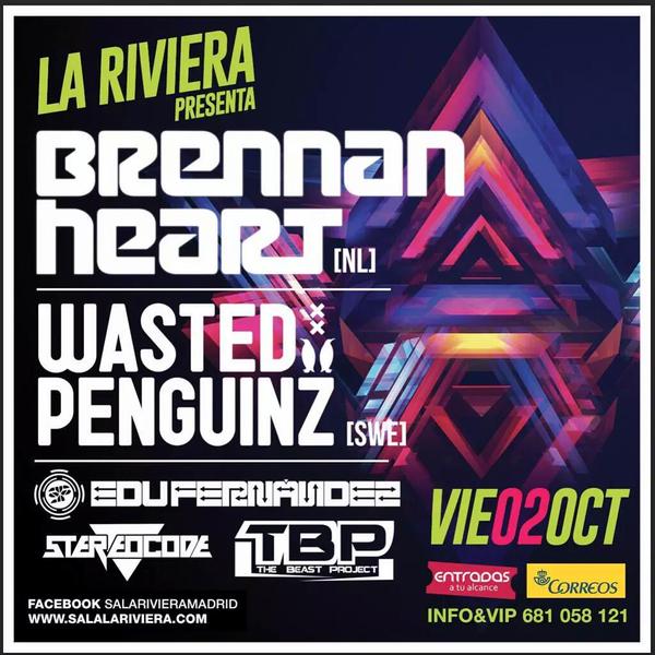 El próximo viernes 2 de octubre podremos disfrutar en la Sala La Riviera de Madrid, de una grandísima fiesta hardstyle, que contará con grandes nombres. El euphoric tendrá la mayor parte de protagonismo, con dos headliners de primer nivel mundial. Ellos son Brennan Heart y Wasted Penguins. El primero de ellos se encuentra en un espléndido momento, quizás el mejor en su carrera, con un reconocimiento cada vez más amplio, y con un número de seguidores en España en aumento, tras sus últimas actuaciones en nuestro país. El dúo sueco Wasted Penguinz, es otro de los pesos pesados del euphoric , que llegará a Madrid dispuesto a ofrecer una gran ración del mejor hardstyle de la escena mundial.