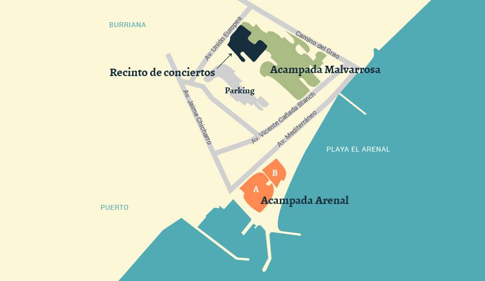 Una de las novedades que ofrecerá par este año, será el cambio de recinto. Tras una demanda por parte de los vecinos de Burriana, el festival deberá desplazarse para poder ser realizado, aunque afortunadamente será en una zona cercana, por lo que se mantendrán las dos zonas de camping de costumbre. Este es el plano con la nueva ubicación del recinto de conciertos: