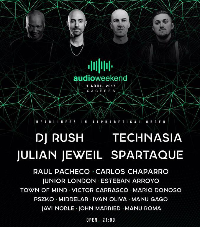 Junto a ellos encontramos también a gran cantidad de djs nacionales y extremeños liderados por RAÚL PACHECHO y CARLOS CHAPARRO. Este es el lineup que completa la programación de Audioweekend: Junior London + Esteban Arroyo + Town Of Mind + Víctor Carrasco + Mario Donoso + Pszko + Middelar + Iván Oliva + Manu Gago + Javi Noble + John Married + Manu Roma