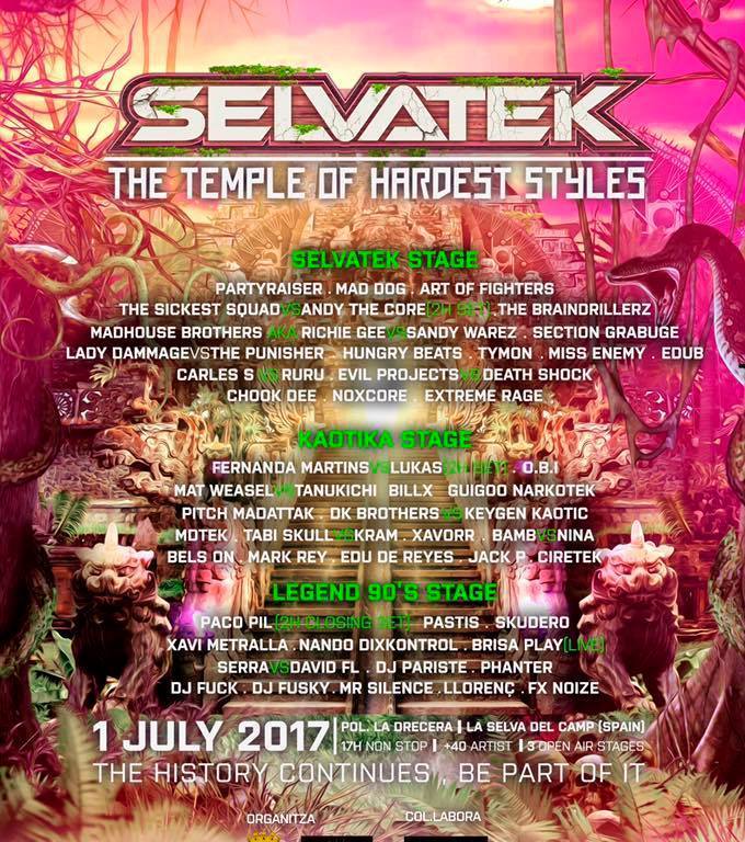 El escenario Selvatek acogerá a grandes estrellas internacionales del hardcore, uptempo y Frenchcore como son el holandés PARTYRAISER, los italianos ART OF FIGHTERS, ANDY THE CORE, THE SICKEST SQUAD, MAD DOG y THE BRAINDRILLERZ o el belga Sandy Warez, que unirá fuerzas con el español Richie Gee para ofrecer un gran set de MAD HOUSE BROTHERS. En el plano nacional también destacan actuaciones como los versus entre LADY DAMMAGE y el francés THE PUNISHER, el de DEATH SHOCK y EVIL PROJECTS o el de CARLOS S y RURU. Por este escenario también pasarán otros djs internacionales y nacionales como SECTION GRABUGE, HUNGRY BEATS, TYMON, MISS ENEMY, EDUB, CHOOK DEE, NOXCORE y EXTREME RAGE.