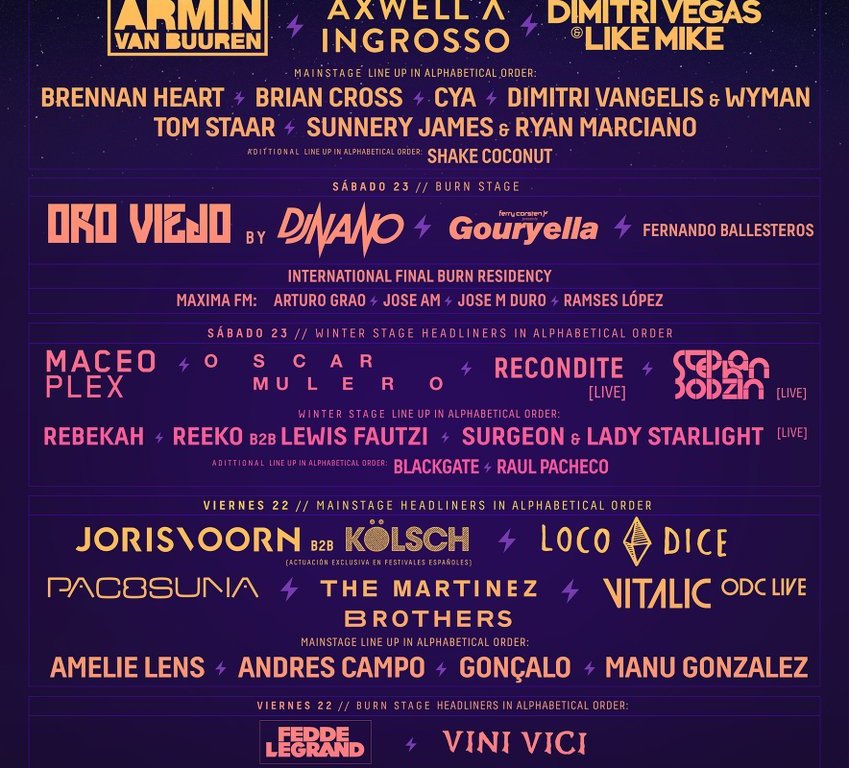 LineUp completo: Axwell /\ Ingrosso + Armin van Buuren + Dimitri Vegas & Like Mike + Brennan Heart + Tom Staar + Dimitri Vangelis & Wyman + Sunnery James & Ryan Marciano + Brian Cross + CYA + Shake Coconut