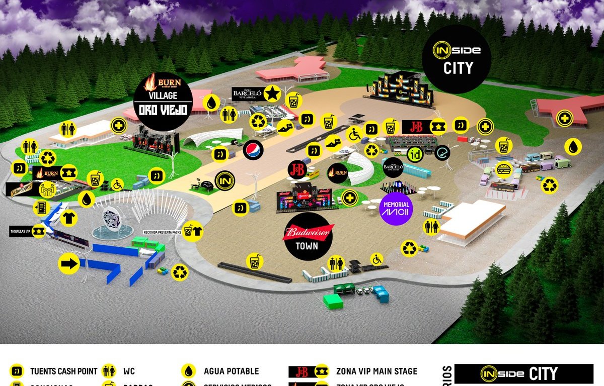Con 3 grandes escenarios, diversos puntos de barras, aseos, zona de comida, puntos de Tuents Cash, baños, etc etc, la Ciudad del Rock se convertirá literalmente en una pequeña ciudad para hacer que sus asistentes vivan una experiencia completa e increíble con todo tipo de comodidades. Por todo el recinto se pueden encontrar además zonas de descanso, así como zonas publicitarias de diversas marcas como Inside, Schweppes, Barceló, Pepsi o Burn (quienes contará con una fiesta sorpresa en un punto secreto del recinto), así como una zona muy especial dedicada a la estrella de la electrónica Avicci, recientemente fallecido a su temprana edad de 28 años: un gesto sin duda muy bonito y emotivo.