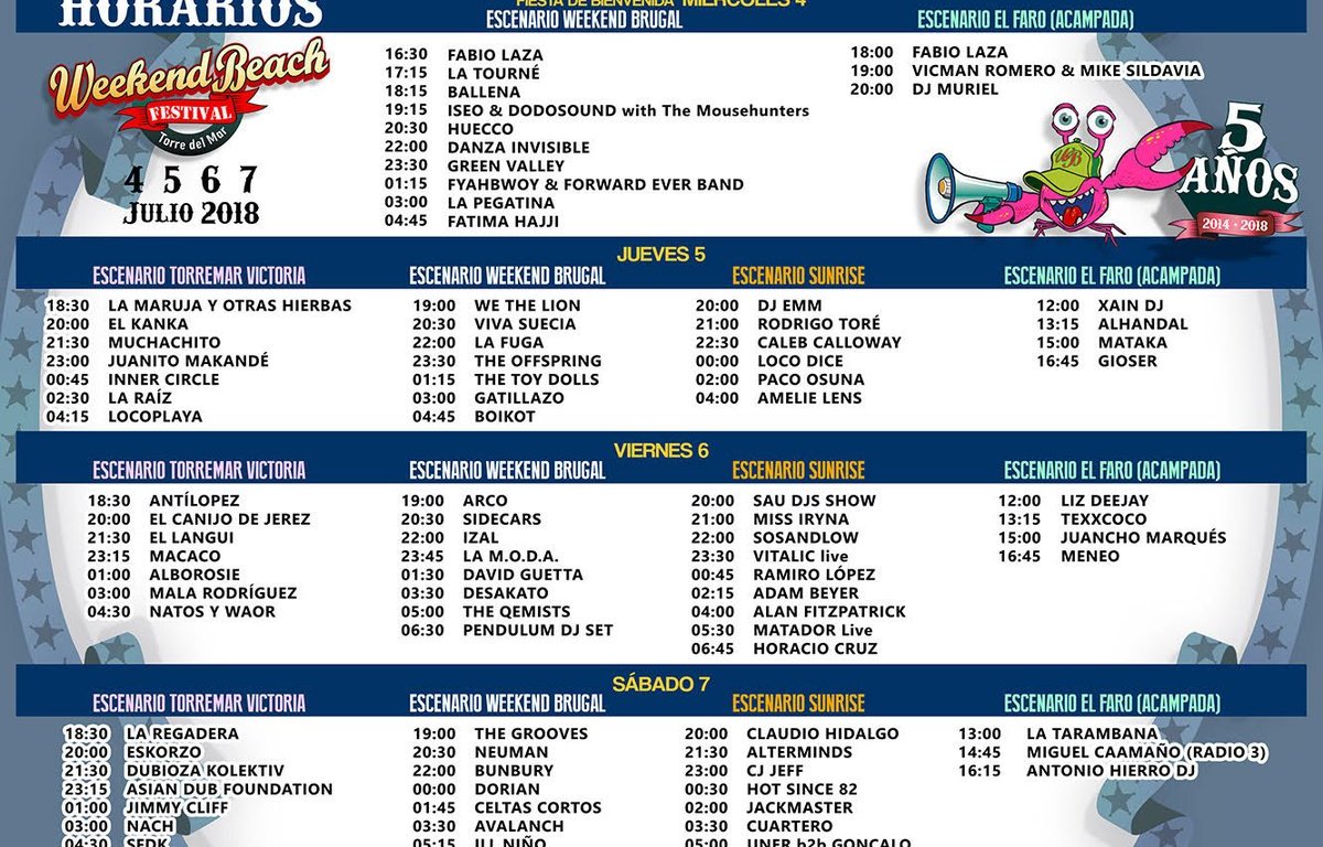Este fin de semana el festival malagueño WeekendBeach de Torre del Mar celebrará su 5º Aniversario por todo lo alto. En los últimos días hemos podido conocer los horarios de actuaciones de la programación de tal ocasión.