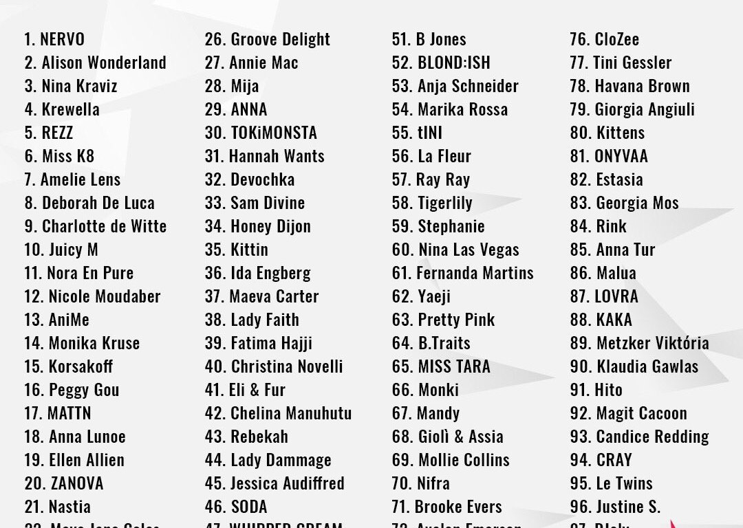 Las hermanas NERVO han logrado de nuevo el primer lugar en este año, viéndose acompañadas por Alison Woderwall, que repite en segunda posición y Nina Kraviz (3) en los primeros puestos. EDM, Bass, Techno, Hardstyle son los estilos que cuenta con mayor representación en la lista, algo que se ve claramente en el top 10, el cual lo completan: Krewella (4), REZZ (5), Miss K8 (6), Amelie Lens (7), Deborah de Luca (8), Charlotte de Witte (9) y Juicy M (10).