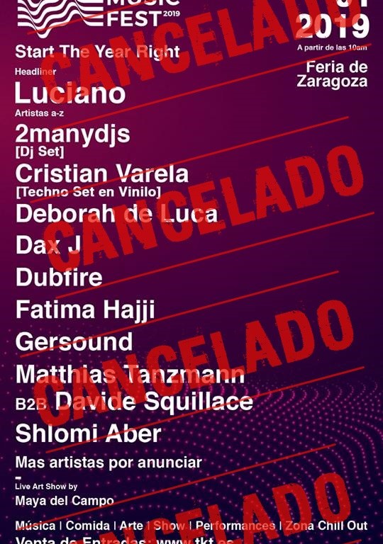 UNO Music Fest se iba a celebrar el día 1 de enero en la localidad de Zaragoza. Para la ocasión se había programado un variado cartel donde destacaban varias estrellas internacionales del techno en diferentes variantes como Luciano, Dubfire, 2manyDjs, Deborah de Luca o Cristian Varela entre muchos más. Sin duda es una pena que el festival no pueda llevarse a cabo, ya que hablamos de una puesta en escena bastante importante.