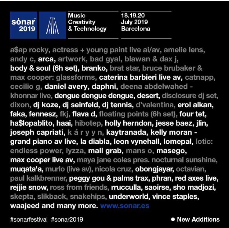 Tras presentar un primer avance de cartel cargado de grandes actuaciones (Dixon, Disclosure, Paul Kalkbrenner, Andy C, Amelie Lens...), el festival barcelonés Sónar ha anunciado un segundo avance con gran cantidad de nuevas incorporaciones al cartel. El festival que tendrá lugar del 18 al 20 de Junio en la ciudad condal suma así a varios referentes a nivel mundial que harán del evento aún más interesante.