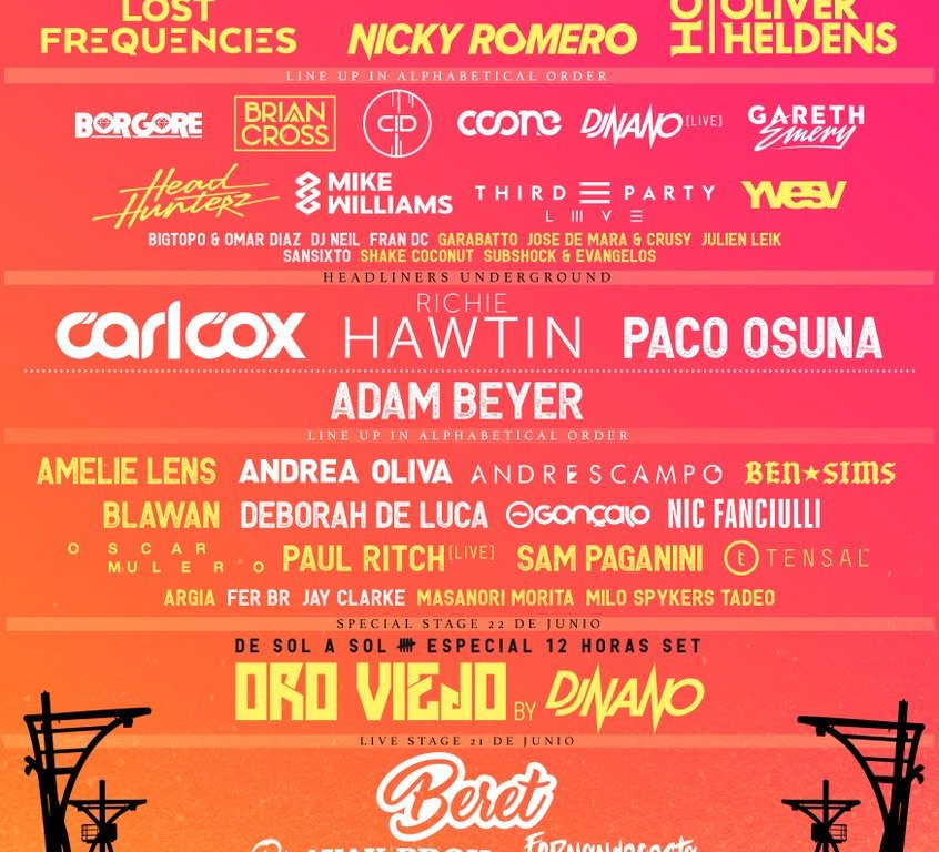 Underground (Techno, Deep House, Tech-House…): Carl Cox + Richie Hawtin + Paco Osuna + Adam Beyer + Nic Fanciulli + Andrea Oliva + Deborah de Luca + Andrés Campo + Gonçalo + Fer BR + Jay Clarke