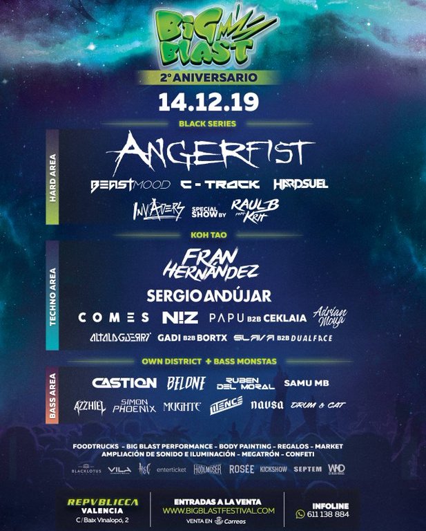 Big Blast ha sabido hacer que Valencia pueda disfrutar de música electrónica variada de la mano de referentes de primer nivel como en este caso Angerfist y en ediciones anteriores con djs como Da Tweekaz, Dirtyphonics, Cesqeaux, Curbi, Mike Cervello, Sephyx, Fran Kvitta, Sandro Silva, Mightyfools, Moksi, Karretero, Ruthless, Mandy, LNY TNZ o Vidaloca entre otros, así como con diferentes djs de la región y del país que destacan bien por su gran trayectoria o bien por ser talentos emergentes que darán mucho que hablar en el futuro. Si eres de la zona, ya sabes que este sábado 14 tienes una cita con Big Blast. Aquí os dejamos el cartel completo: