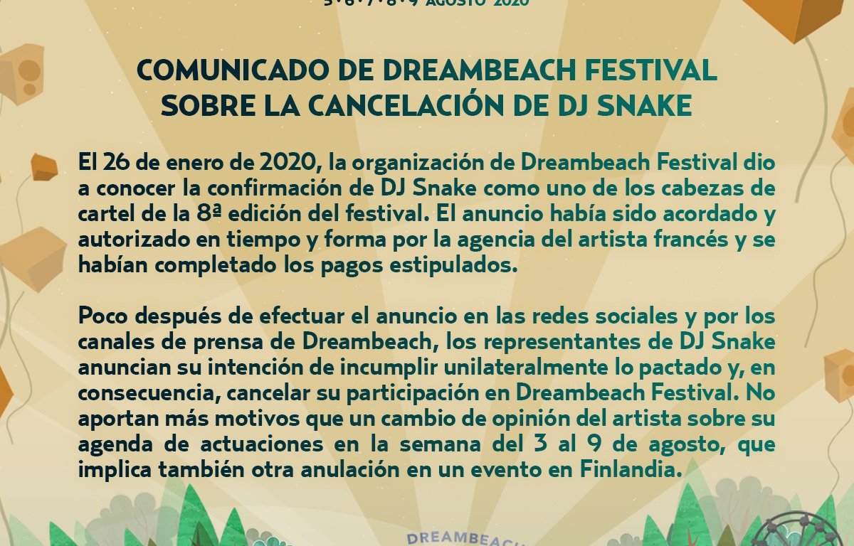 Todo apunta a que ha habido un malentendido entre el apartado de contratación y dirección artística de Dreambeach y la agencia representante del artista y el propio Dj Snake. Parece ser que las negociaciones estaban muy avanzadas con la agencia de representación, pero la misma no había contado aún con el ok del entorno más cercano del artista. De esta manera, es la propia agencia la que ha causado el malentendido entre ambas partes, ya que en ocasiones hemos visto como las agencias tienen una influencia a veces excesiva, ya que pueden llegar a producir situaciones incoherentes como así ha sido en esta ocasión.