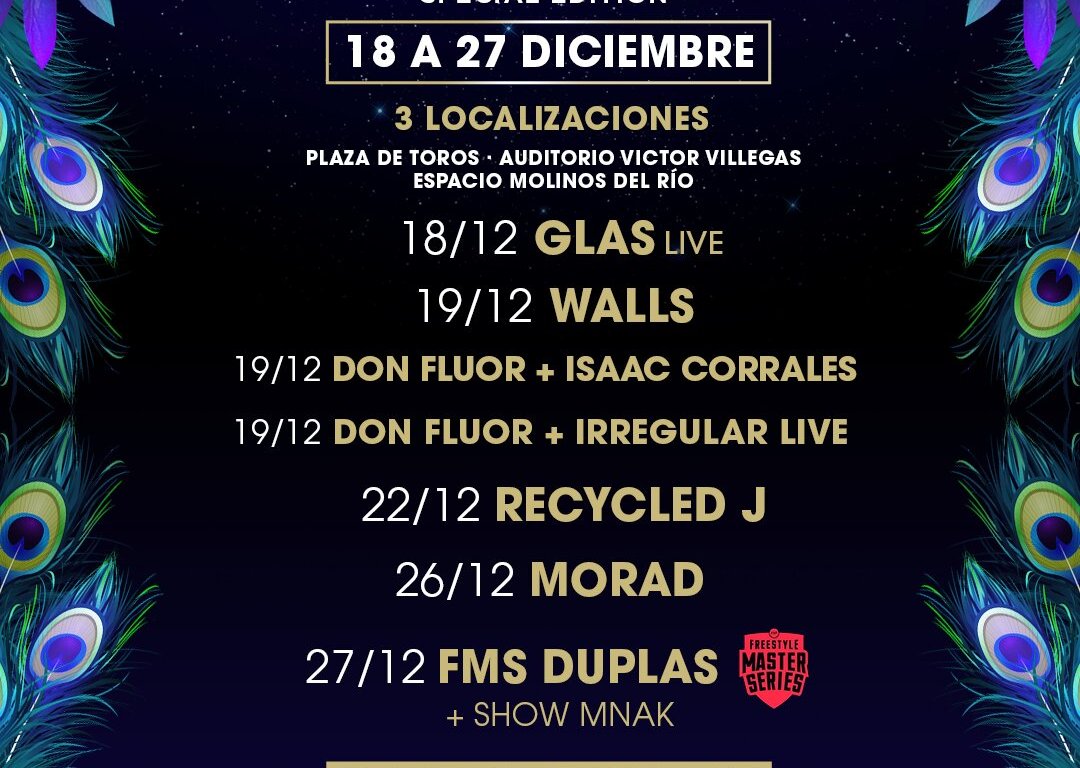 En estas citas con la música, los protagonistas serán la música electrónica y la urbana, con presencia de artistas como WALLS, RECYCLED J, DON FLÚOR o IRREGULAR LIVE, quienes harán disfrutar a un público murciano que ha echado mucho de menos a su gran festival. Estos conciertos tendrán lugar en 3 localizaciones de la ciudad de Murcia; la Plaza de Toros, el Auditorio Víctor Villegas y el Espacio Molinos del Río, los cuales se adaptarán perfectamente para la ocasión.