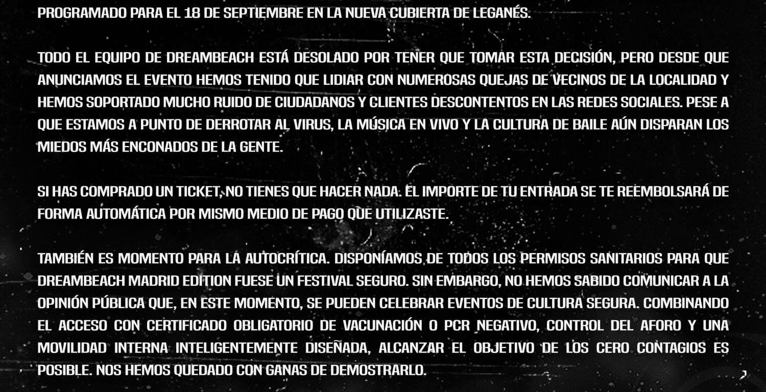 »Es momento para la autocrítica. Disponíamos de todos los permisos sanitarios para que Dreambeach Madrid Edition fuese un festival saludable. Sin embargo, no hemos sabido comunicar a la opinión pública que, en este momento, se pueden celebrar eventos de cultura segura. Combinando el acceso con certificado obligatorio de vacunación o PCR negativo, control del aforo y una movilidad interna inteligentemente diseñada, alcanzar el objetivo de los cero contagios es posible. Nos hemos quedado con ganas de demostrarlo».