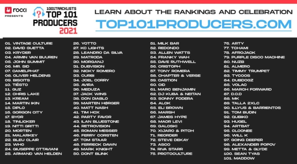 Una ocasión más, cumpliendo a rajatabla su costumbre, el portal 1001 Tracklist ha hecho el anuncio de su Top 101 Productores del año. Como muchos ya sabéis, este top nos muestra los productores cuyos temas han sonado un mayor número de veces en el cómputo de sets registrados por la web, suponiendo así un buen medidor a la hora de ver qué productores han tenido mayor influencia, impacto y presencia en 2021, a nivel mundial.