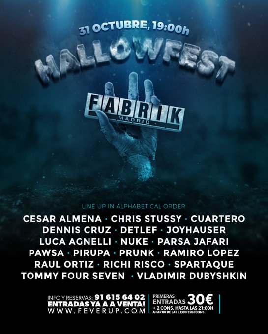 El próximo domingo, 31 de octubre, FABRIK celebrará a su particular modo la festividad de Halloween. Con un gran cartel, la mejor música del momento y la temática de esta festividad, HALLOWFEST hará una llamada a los fans de todas partes de la Península, quienes responderán en masa ante tal ocasión.