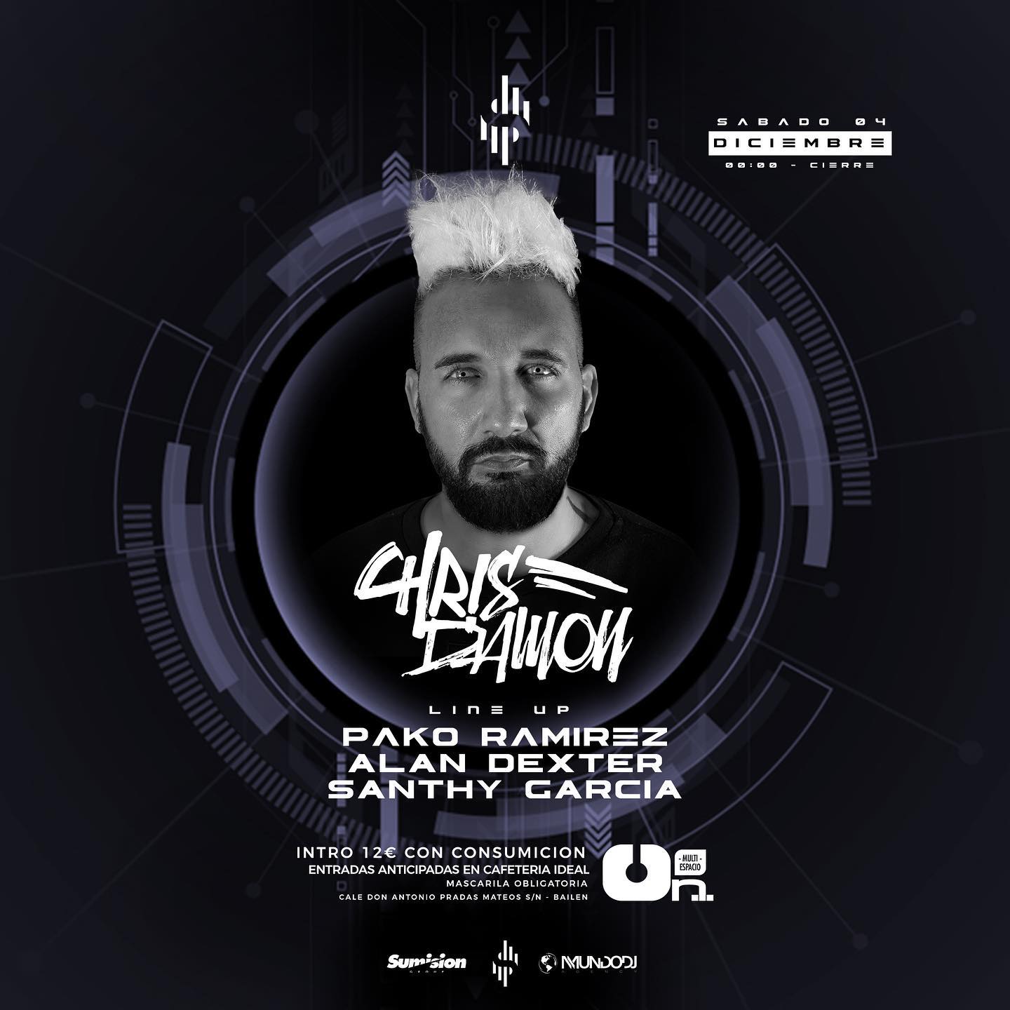 En una cabina con sistema 3D, los djs CHRIS DAMON -encabezando la cita-, PAKO RAMÍREZ, ALAN DEXTER y el residente SANTHY GARCÍA, ofrecerán un fantástico show que involucra aún más al público de una manera muy especial. Los sonidos Tech-House más frescos y con más Groove se postulan como favoritos a tomar las riendas de una genial idea que se llevará a cabo en gran formato por primera vez en la provincia.