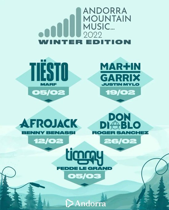 TIËSTO, AFROJACK, MARTIN GARRIX, DON DIABLO y TIMMY TRUMPET serán los grandes headliners de cada una de las 5 fechas con las que contará la cita. Desde el 5 de febrero hasta el 5 de marzo, cada sábado será especial en Andorra gracias a la respectiva visita de cada uno de estos referentes del EDM (cada uno en su estilo), aunque ni mucho menos estarán solos. Y es que hablar de MARF, BENNY BENASSI, JUSTIN MYLO, ROGER SÁNCHEZ y FEDDE LE GRAND como artistas de segundo plano sería un error, lo cuál refleja la fuerte apuesta de este gran evento.