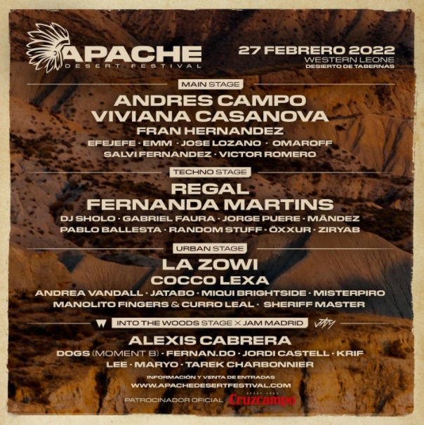 El Desierto de Tabernas será el escenario ideal para un novedoso proyecto musical. APACHE DESERT FESTIVAL llevará a la provincia de Almería a un selecto grupo de artistas que harán que la música sea protagonista en un entorno único. Con 4 escenarios, el evento debutará el domingo 1 de mayo (de 17:00 de la tarde a 07:00 de la mañana) con un llamativo y atractivo cartel.