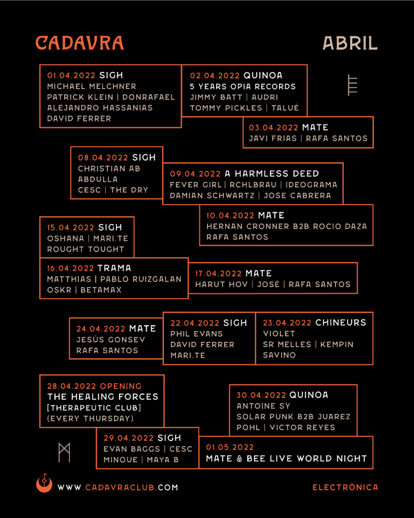 El universo underground, siempre presente cual faro, será testigo de catorce sesiones cargadas del mejor sonido, en uno de los lugares que más está apostando por configurar un sitio de referencia para la cultura clubbing. Durante el mes de abril, la propuesta de Sigh Club seguirá trayendo perlas todos los viernes. Habitando los espacios TheLounge y The Hole, su apuesta abarcará un amplio y empoderado elenco de DJs internacionales y nacionales. A sus inestimables residentes aparece un invitado estrella para cada noche, los más fieles alucinarán con Michael Melchner, Christian AB, Oshana, Evan Baggs o Phil Evans.