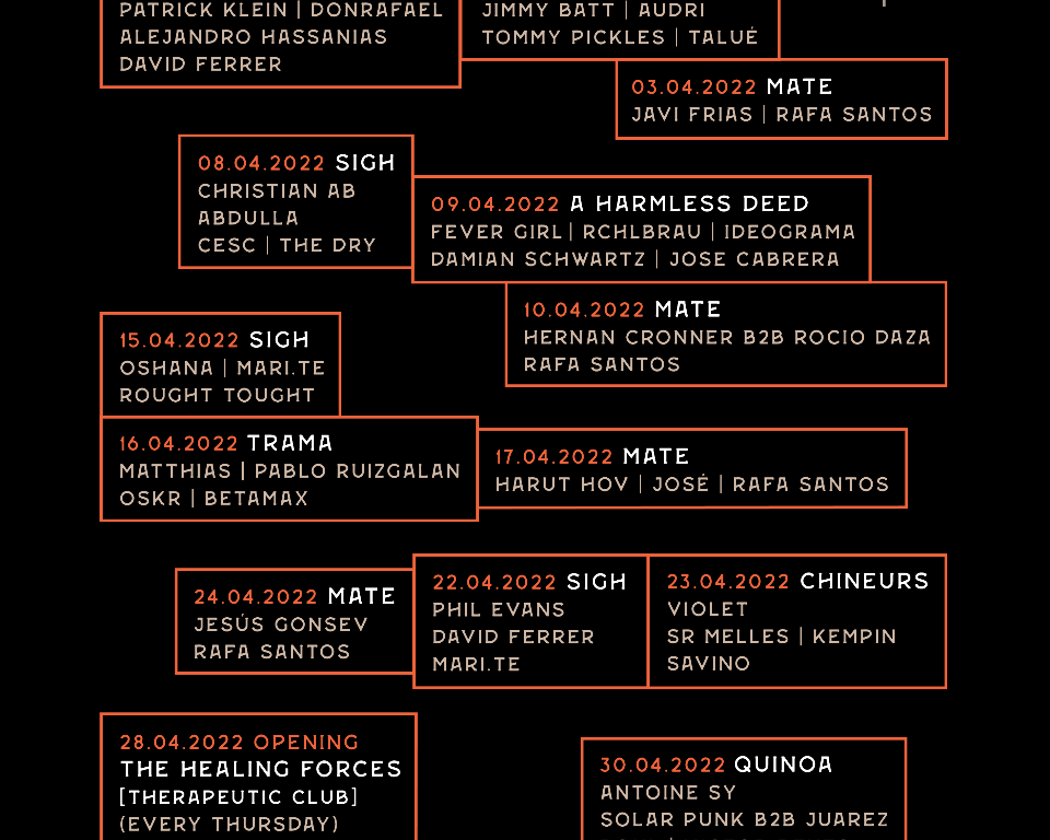 Este potente mes traerá además dos grandes novedades. La primera será la nueva residencia de los domingos, donde el house comandará de la mano del sello madrileño Mate. El tesoro se buscará con deep house o house clásico y mucho jack. Como segunda sorpresa, tendremos el estreno de los jueves de The Healing Forces. Therapeutic club, concretamente será a partir del último del mes, día 28 de abril, cuando el ambient y electrónica de escucha podrán evolucionar hacia electrónica downtempo y ambient techno.