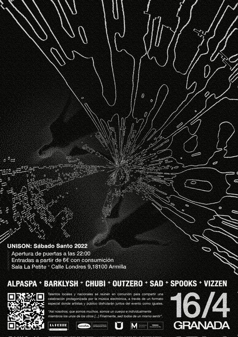 La Sala La Petite de Armilla (Granada) será el punto de reunión para aficionados a partir de las 22:00 de la noche. Por tan sólo 6€ (la entrada incluye consumición), los asistentes podrán disfrutar de varios talentos jóvenes que en diferentes sub-géneros, con gran protagonismo del Bass, pondrán patas arriba la sala andaluza. ALPASPA, BARKLYSH, CHUBI, OUTZERO, SAD, SPOOKS y VIZZEN expondrán su mejor sonido dando forma a un llamativo LineUp que da inicio a lo que pretende ser una marca de fiestas asiduas en el tiempo.