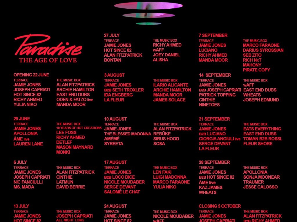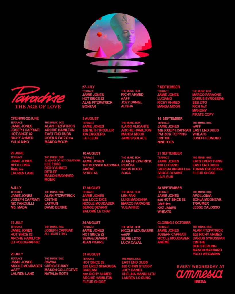 Este verano, la residencia más célebre de Ibiza inaugura una nueva era. Espera lo inesperado y prepárate para quedar asombrado. Planet Paradise 2022 le da la bienvenida a The Age of Love, donde las dimensiones del pasado, el presente y el futuro se desarrollan simultáneamente por primera vez en la mundialmente conocida Amnesia Ibiza. Durante 16 miércoles, Paradise expande su universo desde el 22 de junio hasta el 5 de octubre, y te invita a adentrarte en un mundo surrealista presentado por Jamie Jones.