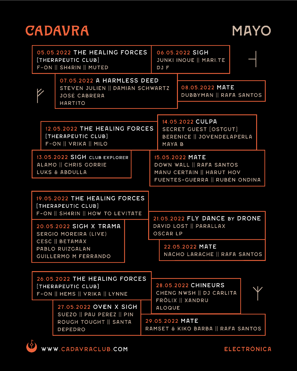 Con apenas tres meses de historia, las paredes de Cadavra Club han visto pasar una barbaridad de calidad musical por sus dos salas. Cada día se abre una puerta directa a mundos sin etiquetas mientras se suman nuevas propuestas sonoras y artistas por descubrir. Es ahora, cuando se anuncia su programación mensual de mayo, cuando muchos paran todo lo que están haciendo para observar con atención. Porque pocas programaciones, ya no solo de la capital, si no de todo el país, pueden igualar la variedad que se propone, tejida con un hilo de estilo sin parangón.