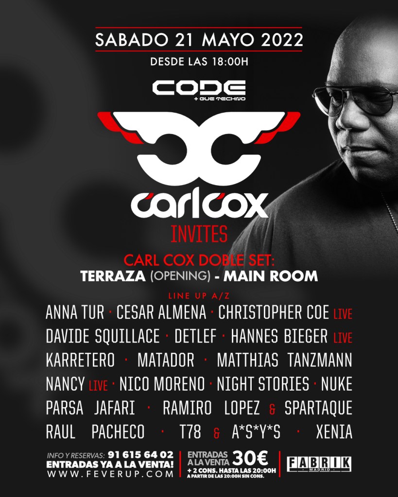CODE es sinónimo de Techno con todas las letras. FABRIK vivirá el sábado 21 de Mayo un evento musical-cultural que hará retumbar los cimientos del mayor complejo de la Península. Sin duda, la visita de una leyenda viva del Techno como Carl Cox, así como los brillantes acompañantes que le respaldarán, harán firmar a la discoteca una de sus mejores noches del año. ¡Os dejamos el cartel completo!: