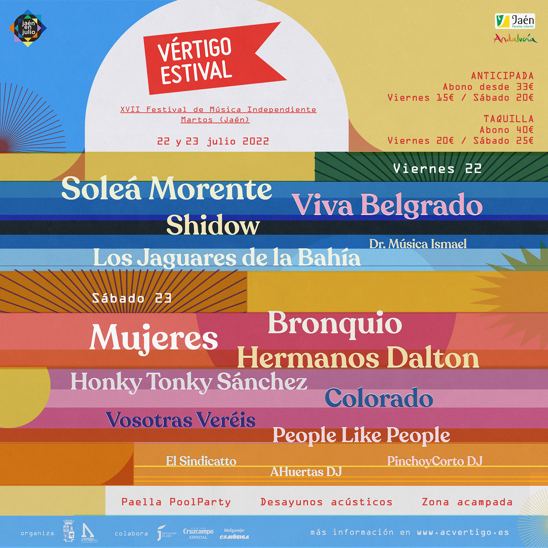 El festival jiennense VERTIGO ESTIVAL anunciaba su programación completa hace apenas unas semanas. El evento músico-cultural de la localidad de Martos, el cuál tomará lugar los días 22 y 23 de Julio, ha confirmado ahora los días de actuación de los artistas que forman parte de su programación.