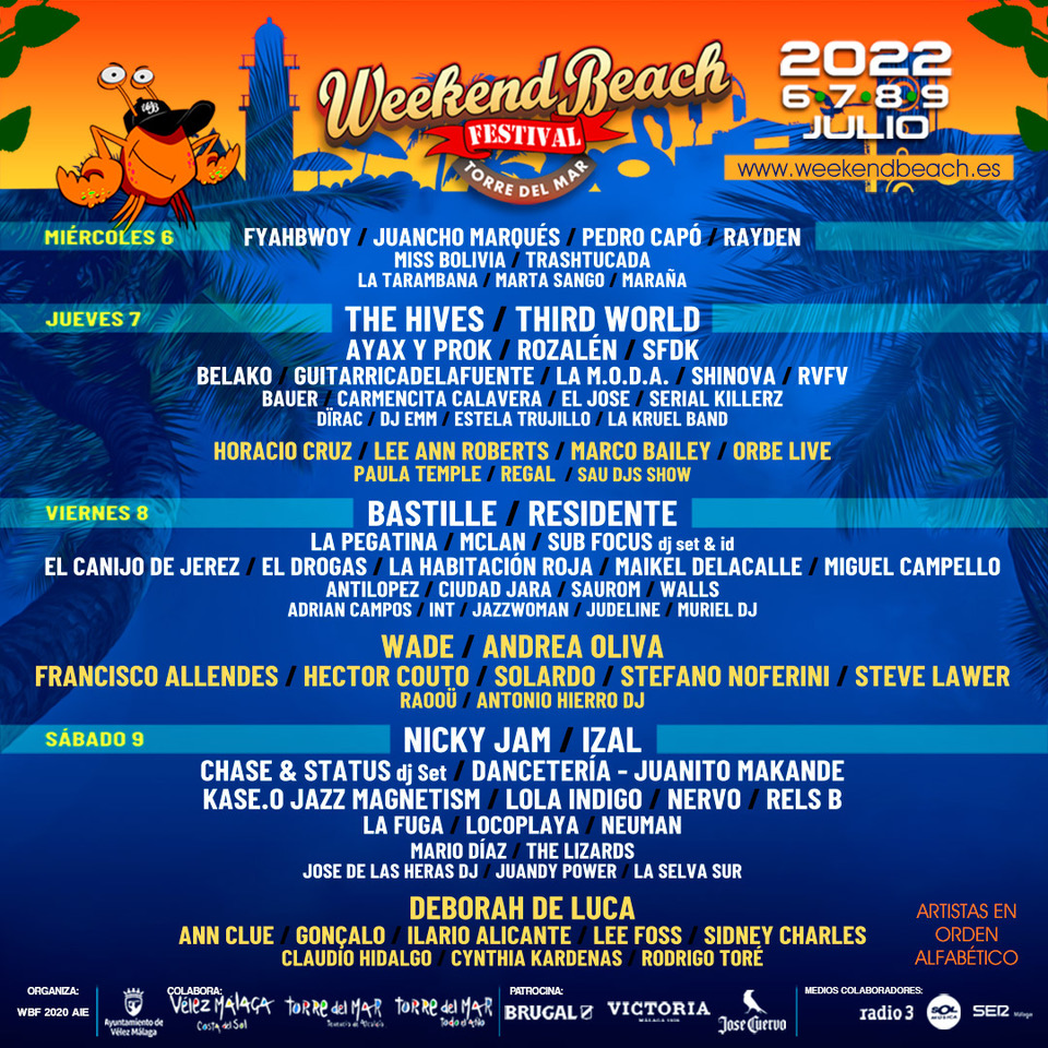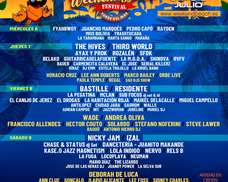 El malagueño WEEKENDBEACH FESTIVAL ha desvelado su programación completa dividida por días de actuación. El evento musico-cultural de Torre del Mar, que regresará a las costas Mediterráneas andaluzas del 6 al 9 de julio, ya puede presumir de programación al detalle tras anunciar los últimos confirmados en el pasado mes de abril.