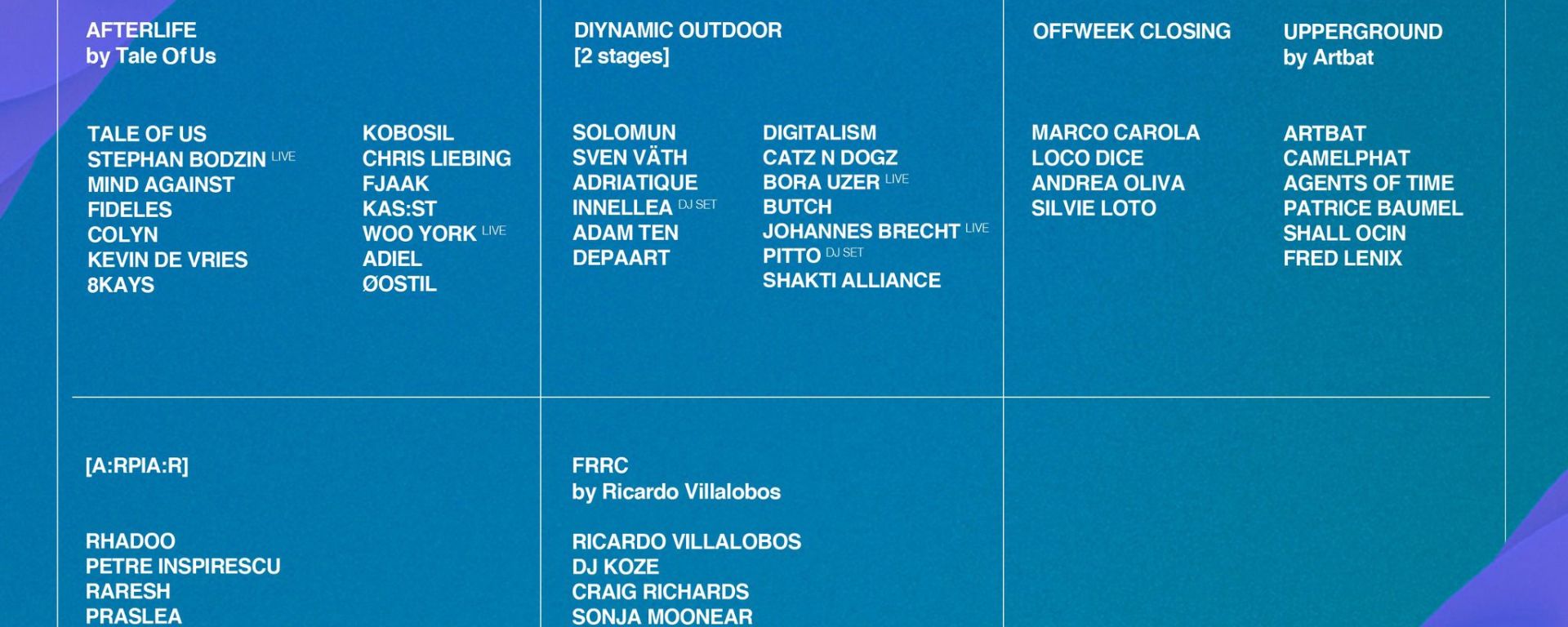 Con un cartel para todos los gustos, el festival dará cabida a los mejores sonidos con programaciones de diferentes temáticas. Por ejemplo, la jornada del viernes estará marcada por la presencia del label AFTERLIFE de los italianos TALE OF US, quienes a base de Techno Melódico y tintes Deep harán disfrutar al público junto a otros referentes como MIND AGAINST o STEPHAN BODZIN (Live). La programación también cuenta en su haber con la presencia del Techno más contundente de la mano de CHRIS LIEBING, KOBOSIL o la formación FJAAK.