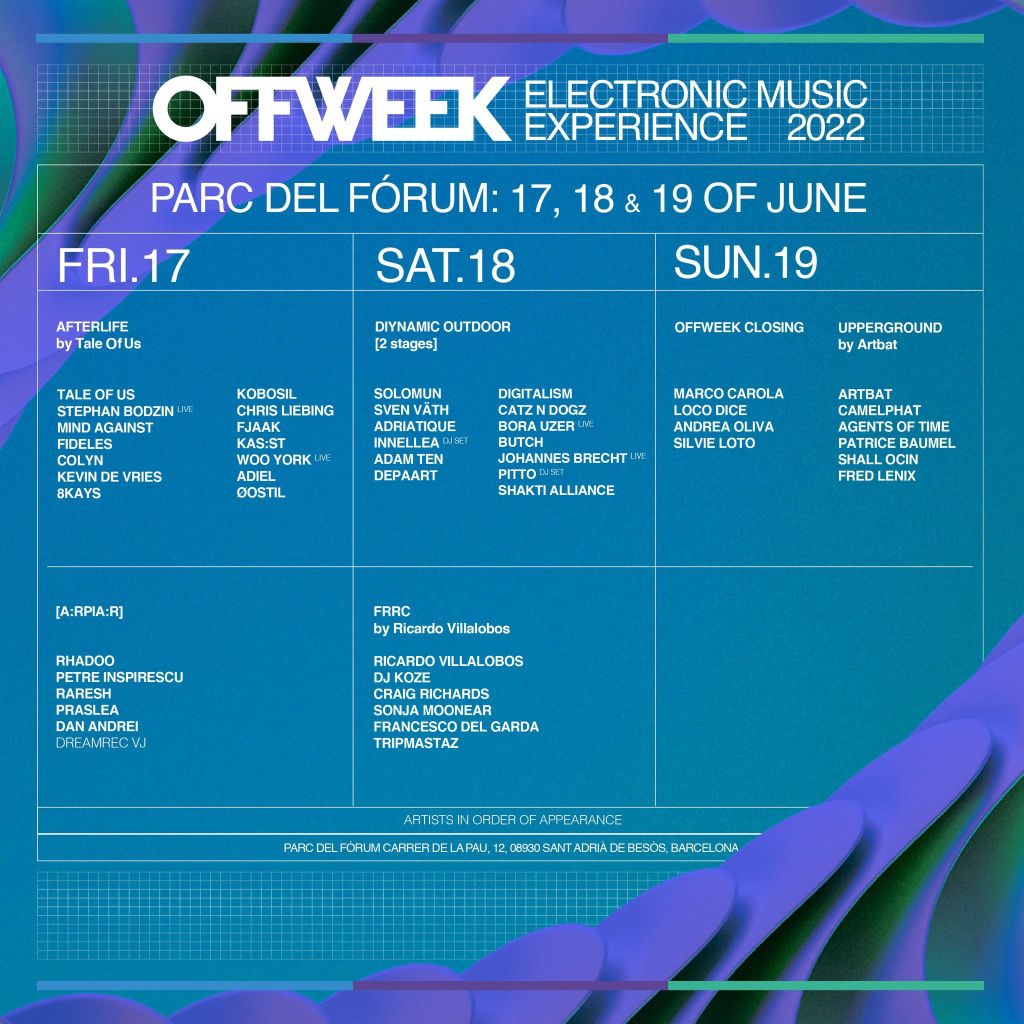 En la segunda jornada el festival mantendrá esos tintes melódicos con artistas como ADRIATIQUE y DEPAART, aunque el protagonismo recaerá sobre los grandes clásicos. SOLOMUN, SVEN VÄTH y en especial RICARDO VILLALOBOS, acapararán los flashes en una propuesta musical muy selecta donde este último liderará un escenario FRRC por el que también pasarán DJ KOZE y CRAIG RICHARDS entre otros. Finalmente, OffWeek se despedirá el domingo a lo grande con la presencia nada menos que de MARCO CAROLA, LOCO DICE y ANDREA OLIVA sobre su Mainstage, así como con el mejor sonido House-Techno melódico (presente durante los 3 días), representado en esa ocasión por CAMELPHAT, ARTBAT, AGENTS OF TIME o PATRICE BAUMEL.