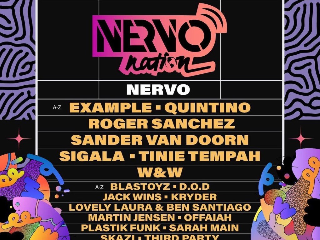Las australianas NERVO llevan más de 10 años siendo protagonistas en la escena EDM global. Girando por los clubes y festivales líderes del mundo, desde Tomorrowland a Ultra Music, actualmente ocupan el puesto 18 en el Top 100 de DJ Mag y han colaborado con pesos pesados como Kylie Minogue, Ke$ha, The Pussycat Dolls, Afrojack, Steve Aoki, Armin Van Buuren o Miley Cyrus. El lineup de NERVO Nation muestra una ecléctica combinación de artistas que incluye figuras del Big Room y el Trance (W&W, Quintino, Sander van Doorn, Martin Jensen, Third Party, Tom Staar, Sigala), clásicos del House (Roger Sanchez, Kryder, Offaiah, Lovely Laura & Ben Santiago), y raperos como Example y Tinie Tempah.