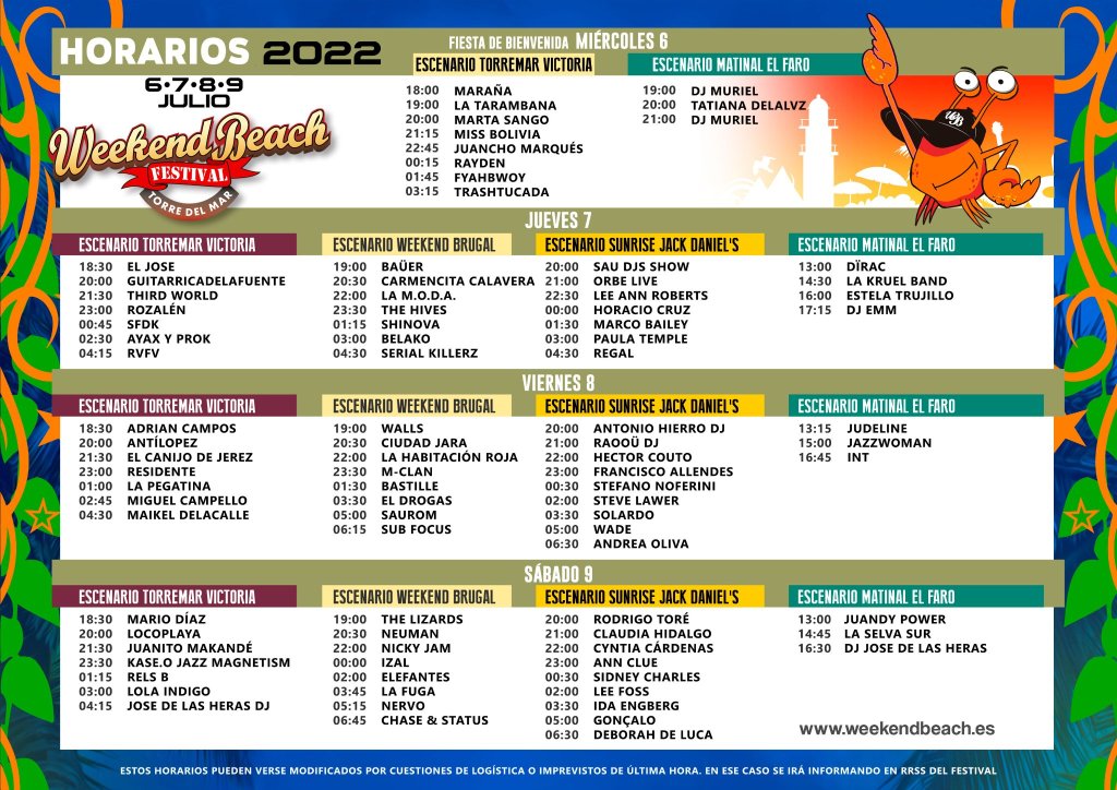 La mejor música en vivo llegará a Torre del Mar (Málaga) el fin de semana del 6 al 9 de Julio gracias a una nueva edición de Weekendbeach Festival. Con gran variedad de estilos sobre su cartel y con artistas punteros de todas partes del mundo que lo darán todo sobre los escenarios, el festival andaluz ha dado a conocer los horarios de actuaciones de su regreso tras la pandemia.