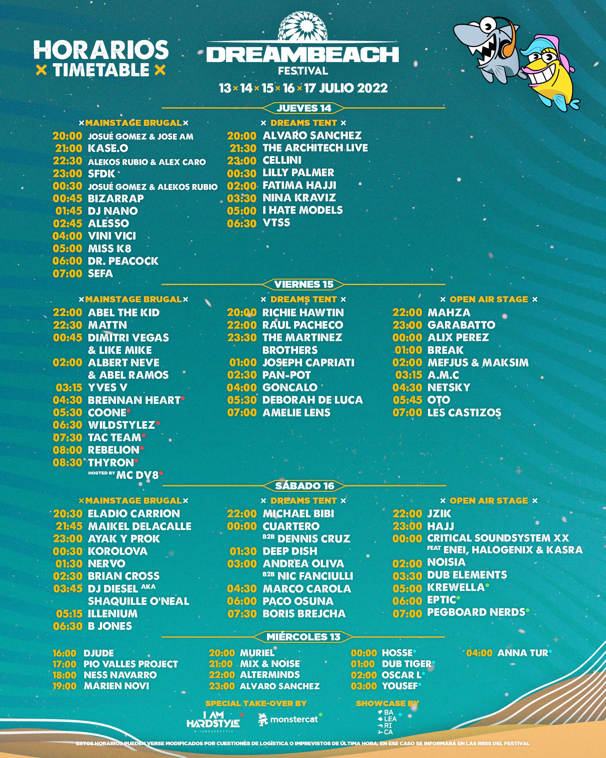 ¡Comienza la cuenta atrás definitiva para Dreambeach Villaricos 2022! El festival almeriense regresará a las playas de Cuevas del Almanzora esta semana (13-17 de Julio) para celebrar una edición muy especial (con actuaciones estelares como las de Alesso, Boris Brejcha, Noisia, Bizarrap, The Martinez Brothers, Yves V, Krewella, Richie Hawtin, Dimitri Vegas & Like Mike, Dj Diesel, Amelie Lens, Netsky, Illenium, Marco Carola, I Am Hardstyle, Nina Kraviz, A.M.C, Sefa, Pan-Pot…) que ya conoce los horarios de su programación al completo.