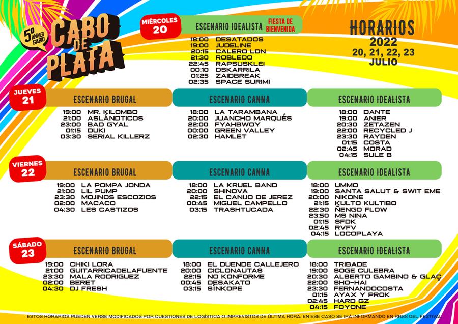 Tras mucho tiempo de espera… ¡Cabo de Plata está de vuelta! La ciudad de Barbate (Cádiz) encara con ilusión el regreso de un evento socio-cultural capaz de congregar a jóvenes procedentes de todas partes del país. Desde el miércoles, con la correspondiente fiesta de bienvenida, hasta el sábado, grandes artistas de diferentes géneros formarán parte de esta nueva edición, de la cual ya se conocen los horarios de actuaciones.