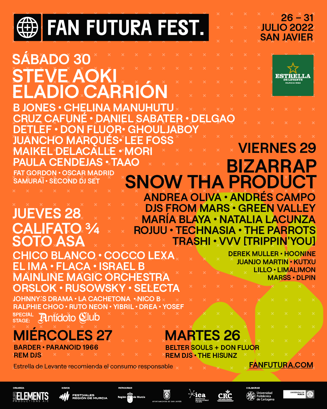 Uno de los nuevos proyectos musicales más ambiciosos de los últimos años en España al fin está a punto de comenzar. FAN FUTURA FEST podrá debutar finalmente esta semana en Murcia, llevando a cabo la propuesta que era presentada hace un par de años y que a causa de la pandemia, debía verse aplazada hasta día de hoy. Durante esta semana, el festival está llevando a Murcia un elenco de artistas nacionales e internacionales de primer nivel en lo que es una enriquecedora variedad de estilos donde la electrónica y la música urbana llevan la voz cantante.