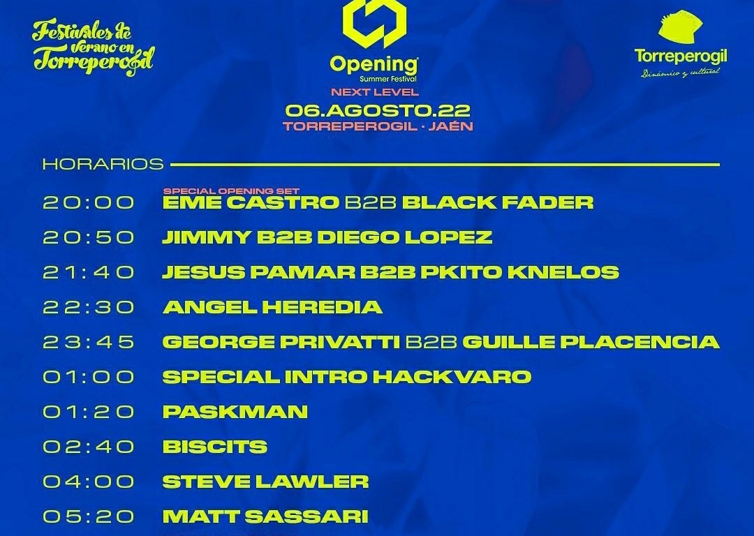 La mayor edición del jiennense OPENING SUMMER FESTIVAL está a punto de comenzar. El que es uno de los mayores eventos Tech-House del sur del país convertirá -una vez más- la localidad de Torreperogil en el centro de la música electrónica durante una vibrante noche. Con un cartel lleno de grandes artistas (Steve Lawler, Biscits, Matt Sassari, George Privatti, Guille Placencia, Raúl Pacheco, Paskman…), los organizadores han desvelado los horarios de actuaciones para una edición que quedará para el recuerdo y que por supuesto, nosotros no nos perderemos!