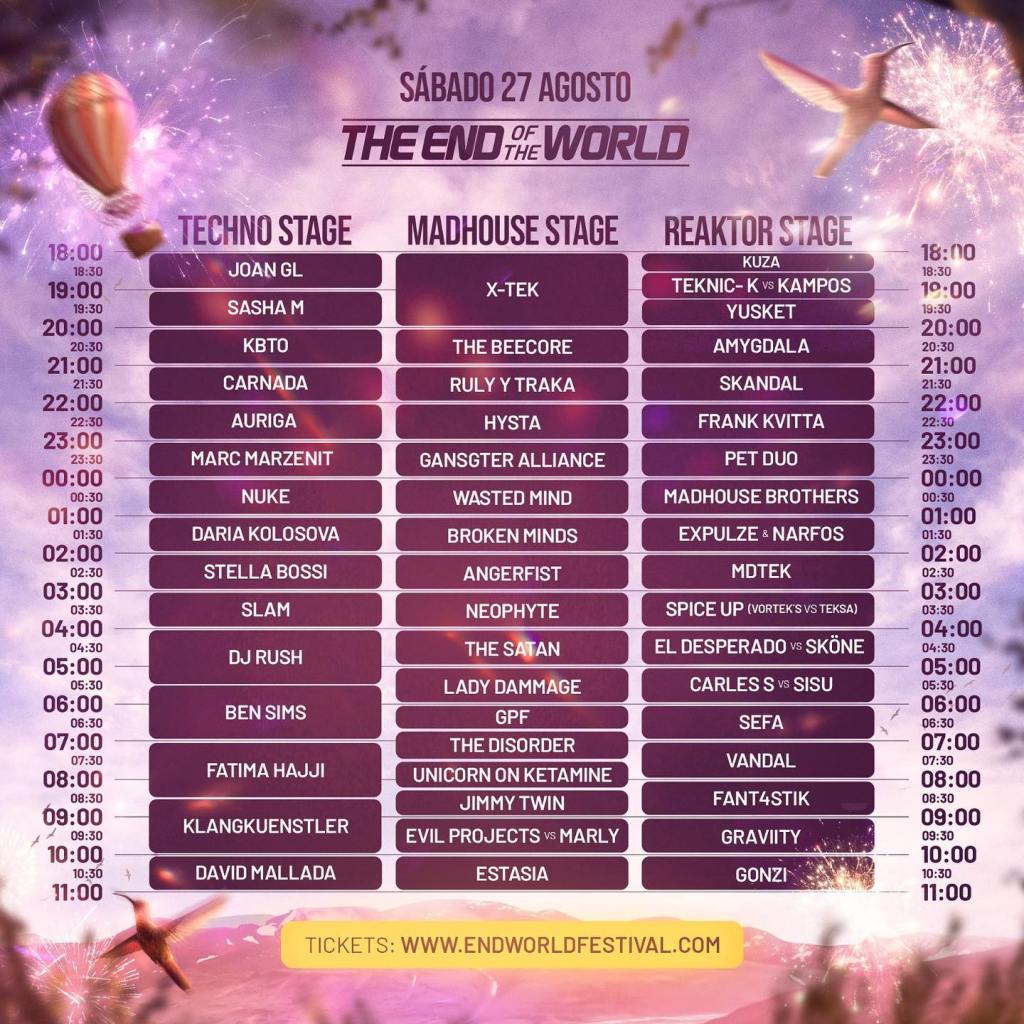 The End Of The World volverá a ser una fantástica cita donde la electrónica relucirá de una forma diferente. Con una identidad clara que se ha convertido en su santo y seña, el festival catalán apostará de nuevo -como nadie lo hace- por el mejor Techno, el Hard más agresivo y por el puro sonido Rave entendido como Hardtek, Schranz y Psy-Trance. ¡Os dejamos los horarios de la programación al completo para que podáis descubrirlo!: