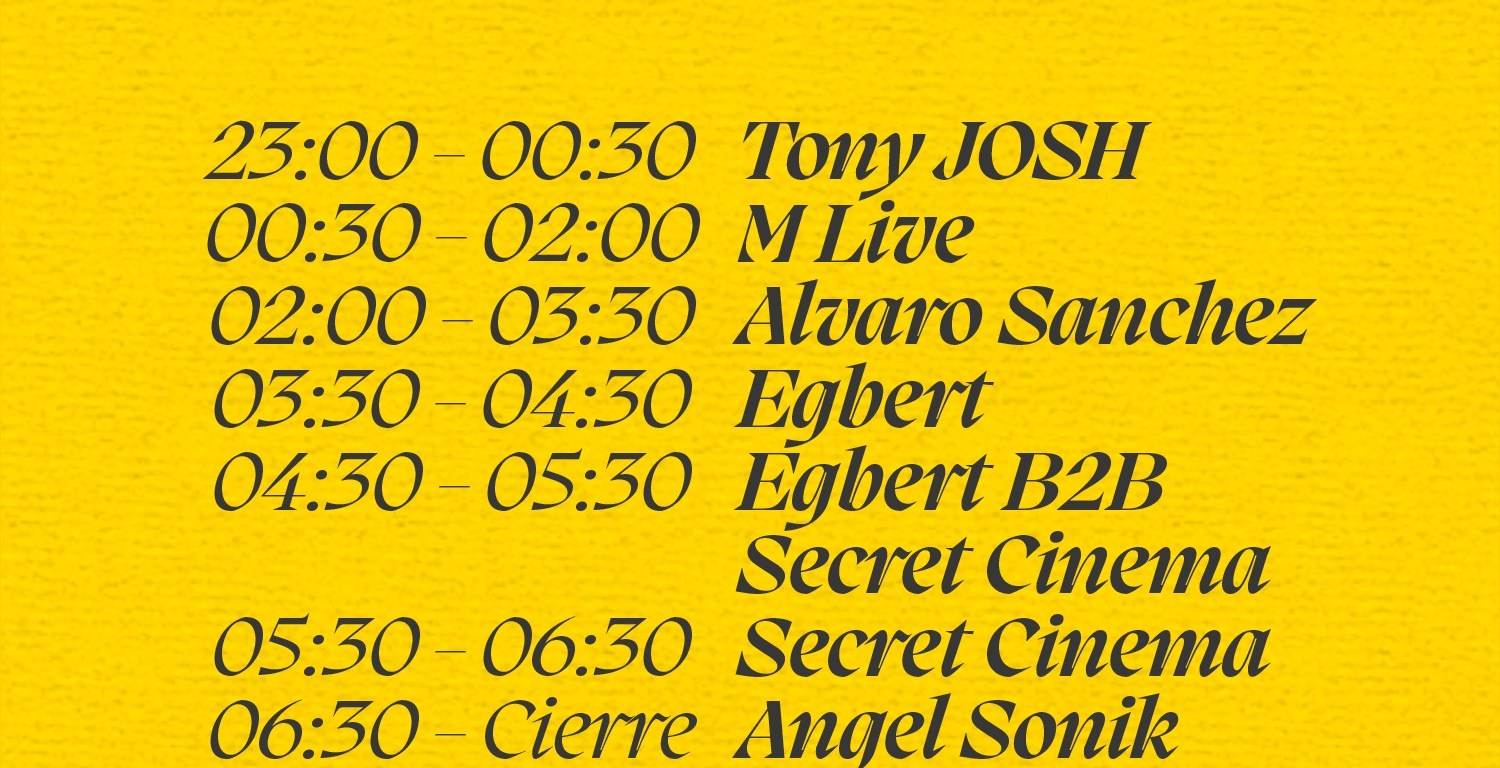 La gran sorpresa de este anuncio ha sido que precisamente los headliners ya mencionados, Egbert y Secret Cinema, protagonizarán un apasionante actuación en formato Back To Back que complementará las actuaciones individuales de cada uno. De tal modo, el festival suma un nuevo atractivo a una velada que promete ser espectacular gracias a ellos, así como a Álvaro Sánchez, Ángel Sonik, M Live y Tony Josh.