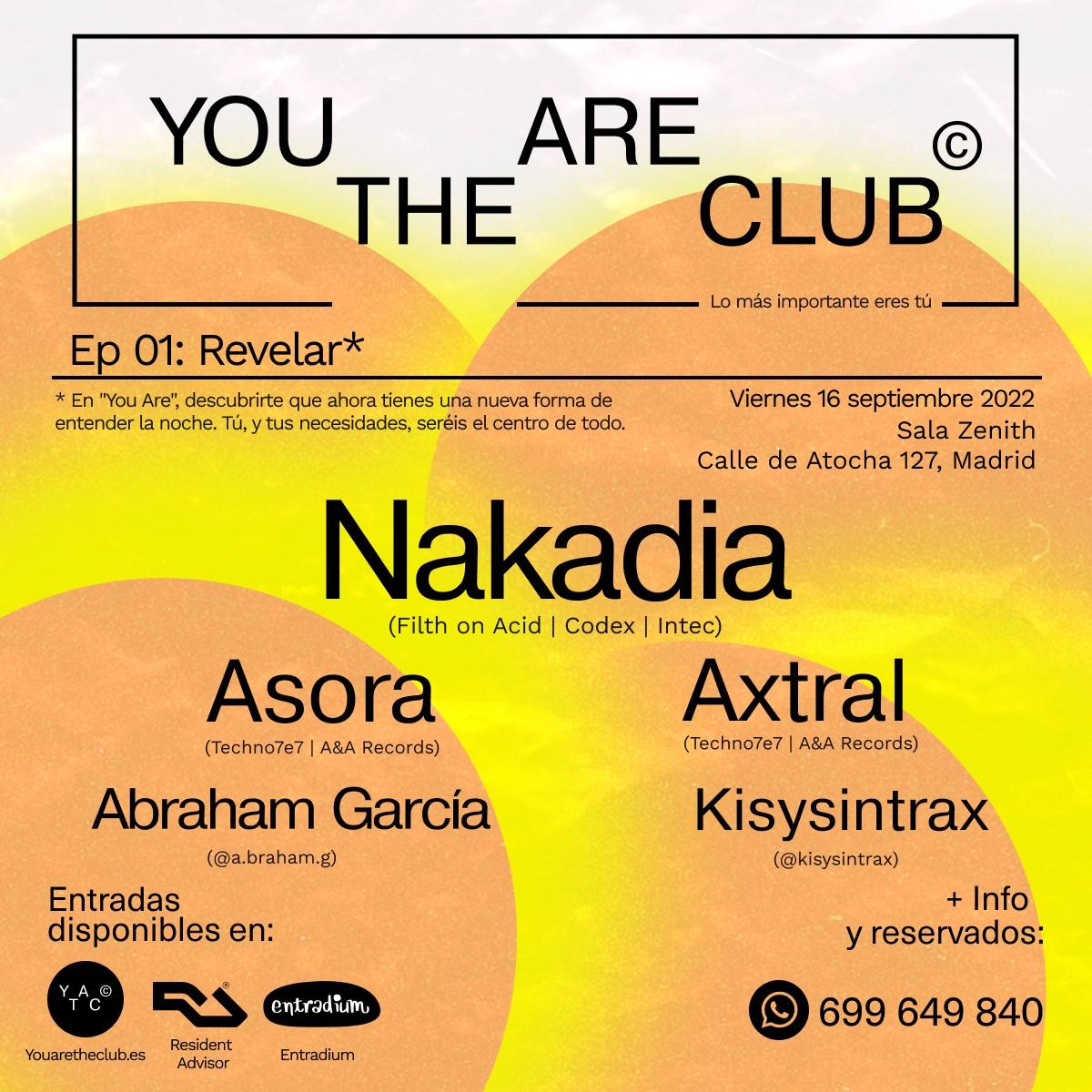 La Sala ZENITH de la capital española acogerá la primera fecha de esta fiesta, la cuál contará con las actuaciones de ASORA, AXTRAL, ABRAHAM GARCÍA y KISYSINTRAX. Como cabeza de cartel, los aficionados podrán disfrutar de NAKADIA, una auténtica fuerza de la naturaleza que demuestra que para alcanzar el sueño del éxito electrónico solo se necesita pasión y determinación. De ese modo, el Techno será protagonista, aunque sin encasillarse en una rama única, ya que todas sus variantes serán bien recibidas, exponiendo una amplia gama donde tendrán cabida Peak Time, sonido Rave, Driving Techno, Minimal, Techno más puro, industrial…