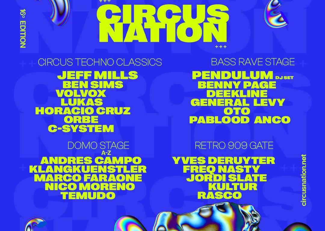 El Techno tendrá mucho protagonismo gracias a la propuesta de los escenarios Circus Nation Techno Classics y Domo Stage. En el primero de ellos podemos ver la presencia de figuras icónicas del género como el estadounidense JEFF MILLS y el británico BEN SIMS. Con un sonido a altas velocidades y la influencia del Techno de Detroit y del Techno Industrial, ambos encabezarán un escenario por el que también pasarán la estadounidense VOLVOX con el mejor sonido minimal, el brasileño LUKAS con la energía del Hard-Techno, así como los españoles HORACIO CRUZ, ORBE y C-SYSTEM, habituales en las mejores citas nacionales.