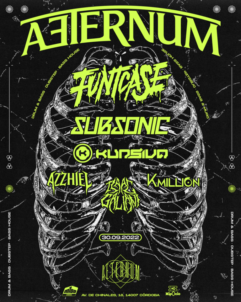 Precisamente en el género Drum And Bass se mueve el líder del elenco nacional de la cita. KURSIVA desplegará todo su potencial en Córdoba para demostrar por qué es uno de los números 1 del Bass en España. Formando parte musical de esta llamativa propuesta también encontramos al valenciano AZZHIEL, un diamante en bruto del Dubstep más poderoso; al onubense KMILLION, que sabe lo que es codearse con los mejores djs del Drum And Bass gracias a su presencia en múltiples eventos; así como el cordobés ISAAC GALIANI, impulsor de esta cita y dj residente de Aeternum.