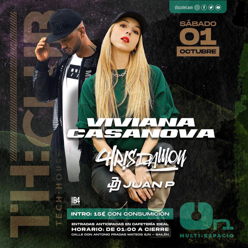 VIVIANA CASANOVA regresa a la provincia de Jaén para ofrecer una de sus fantásticas actuaciones. Tras recorrer importantes festivales, eventos y clubes del panorama nacional este pasado verano, Viviana llegará a ON para demostrar que atraviesa su mejor momento musical. Durante la cita estará acompañada por CHRIS DAMON, uno de los productores jiennenses de mayor proyección a nivel nacional, así como por JUAN P, CEO de Karay Event, quienes harán que el mejor ritmo se prolongue durante toda la noche.