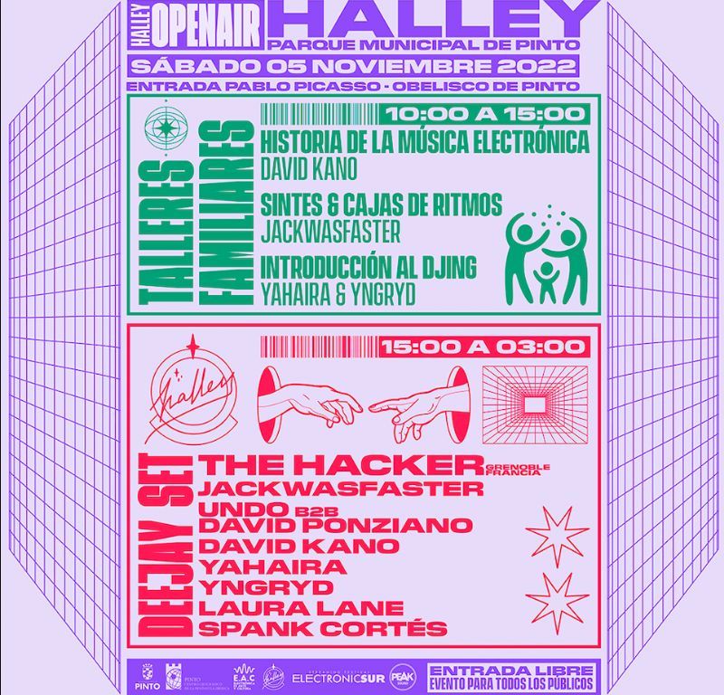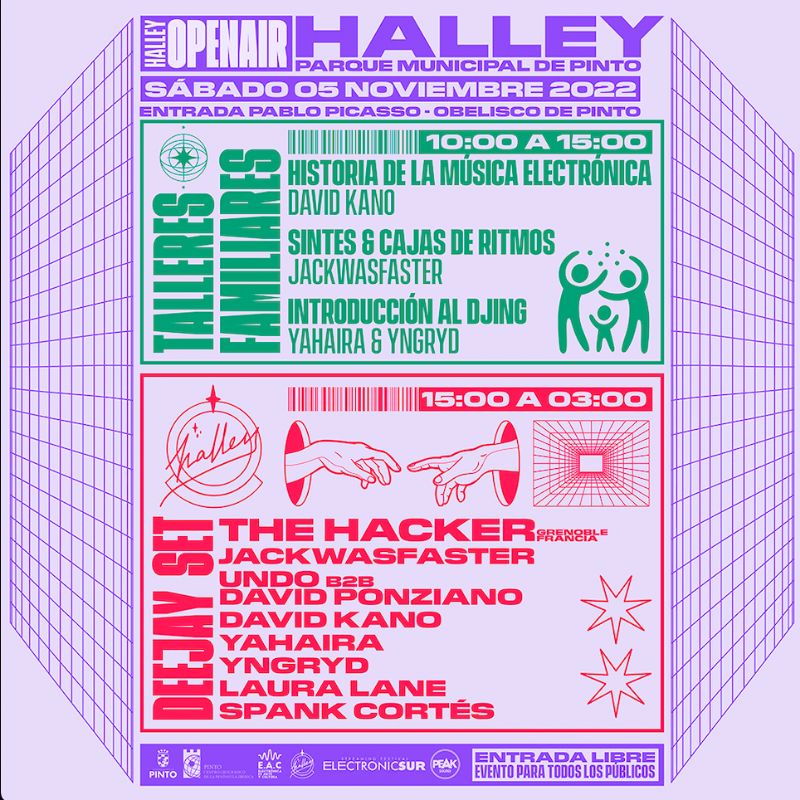 Halley se reinventa, y ofrece un nuevo concepto para el 5 de noviembre en colaboración con el Ayuntamiento de Pinto y la asociación Electrónica es Arte y Cultura. La acción se desarrollará en el Parque Municipal de Pinto, en concreto, en la plaza de Obelisco. Será un evento en el que podremos contar con talleres educativos, donde los padres e hijos podrán disfrutar y saber, un poco más, sobre la cultura electrónica. La cita contará también con un mercadillo de ropa de segunda mano, promoviendo la sostenibilidad. Y, cómo no, con un plantel de DJS, de primera línea, encabezado por el francés The Hacker, acompañado por Undo, David Ponziano, Jackwasfaster, David Kano, Yahaira, Yngryd, Laura Lane y Spank Cortés.